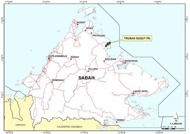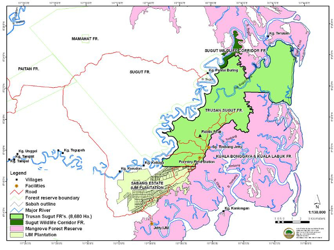 Trusan Sugut FR is part of a larger area being established for long-term conservation called “Sugut Conservation Area (SCA)”. Along with Trusan Sugut FR, the adjacent Sugut Wildlife Corridor FR, Kuala Bonggaya and Kuala Labuk mangrove FR, Sg. Sugut, Sg. Paitan and Jembongan mangrove FR, and the conservation zone of Sugut FR (Class II, production) form the larger conservation area, the SCA. This FMP covers only the Trusan Sugut FR, while it keeps the larger SCA in view while planning the management activities.