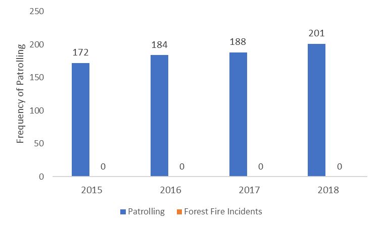 The Protection unit was formed to patrol and monitor forest fire incidents across the project area. Patrolling was done by ground patrol, river patrol and aerial surveillance. In 2018, frequency of patrolling activities has increased to 201 days as compared to previous years. This include 812 km and 315 km distances of river patrolling along the Segama-Bole River and Malua River respectively, and 2 aerial surveillances which was carried out in February and June 2018. Since 2015, no forest fire incident was detected as shown in Figure 1 and Figure 2.