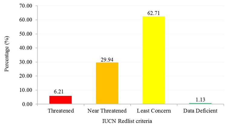 Figure 8: Fractions and percentage of bird species recorded within the Ulu Segama – Malua Sustainable Forest Management project area under IUCN red list criteria in 2017